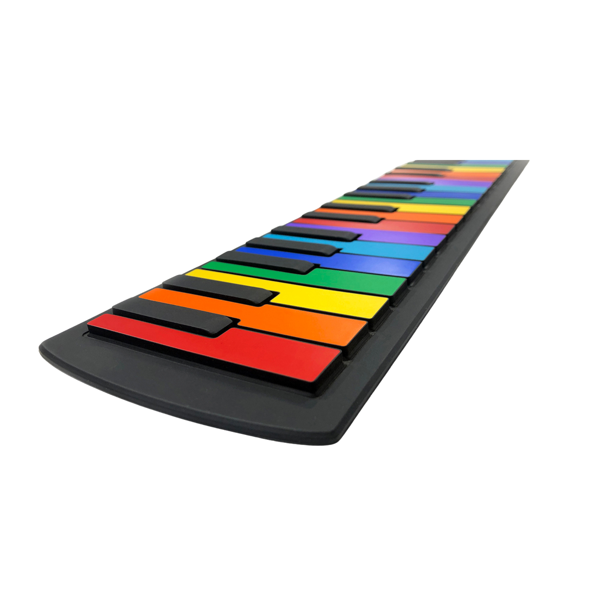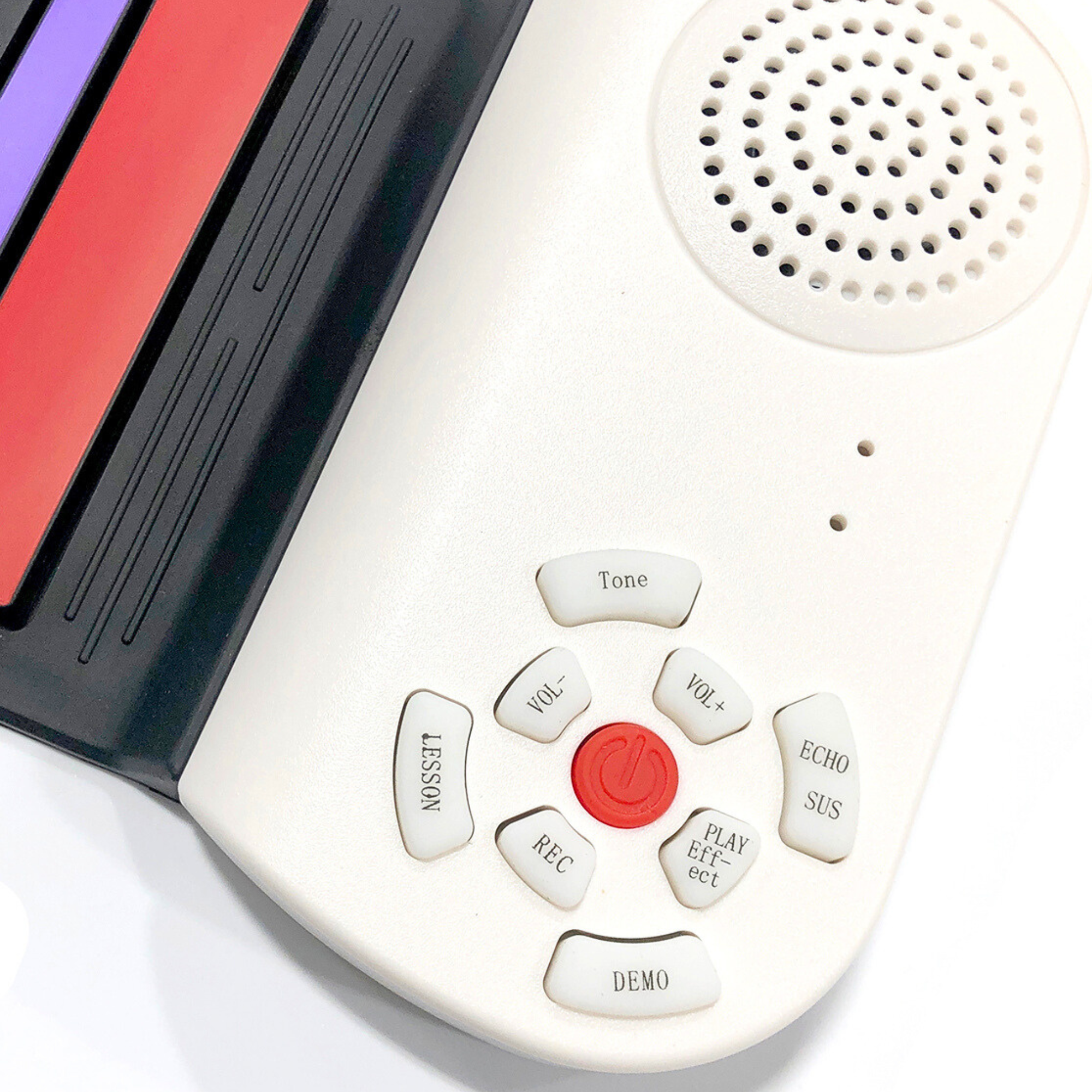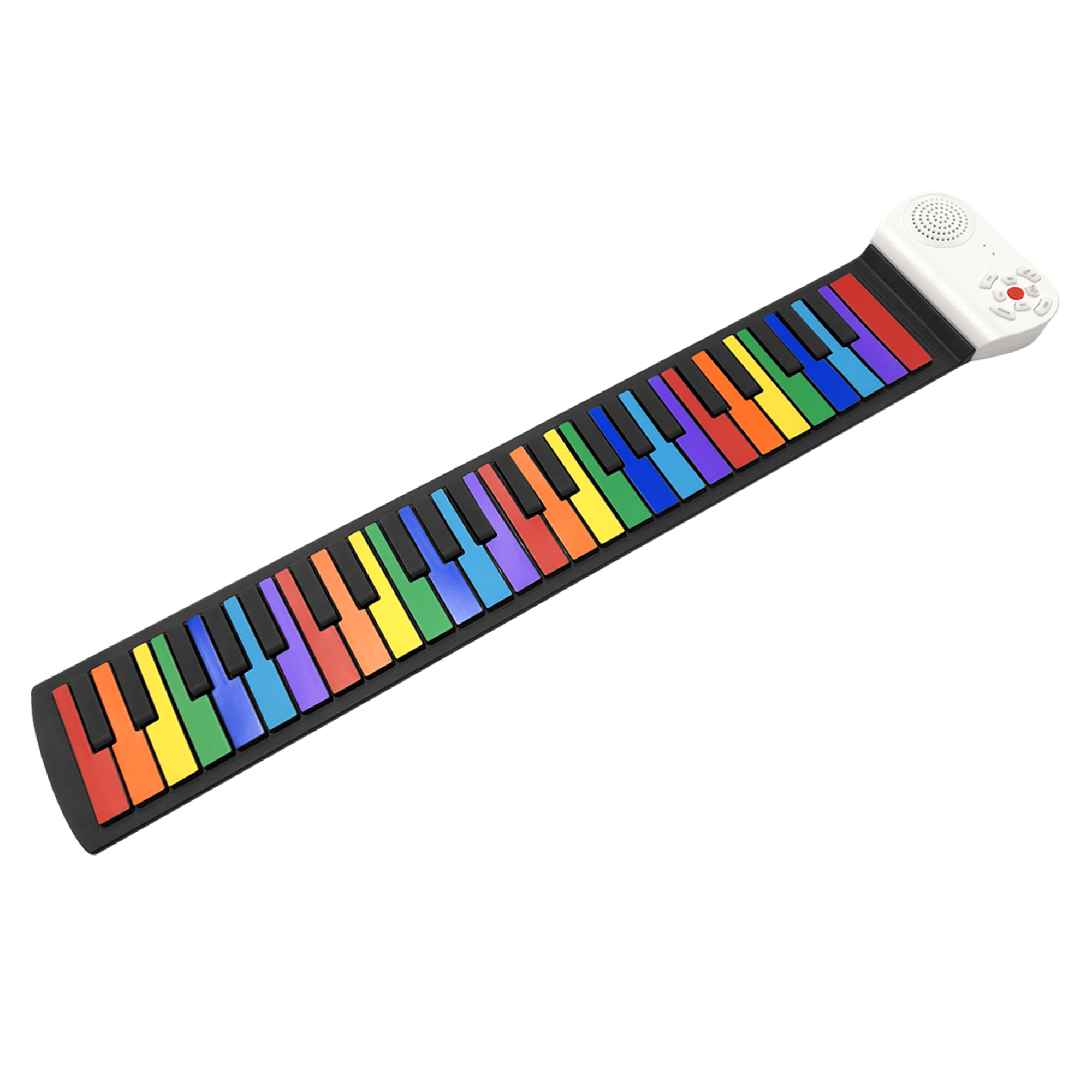 This Rainbow Piano features 49 keys and plays different tones. Multiple sound effects including Echo and Vibrato. Six demo songs can be played with a push of a button. Children can record and replay songs. A headphone jack allows the piano to be played by one person. The adjustable speaker is loud and clear.