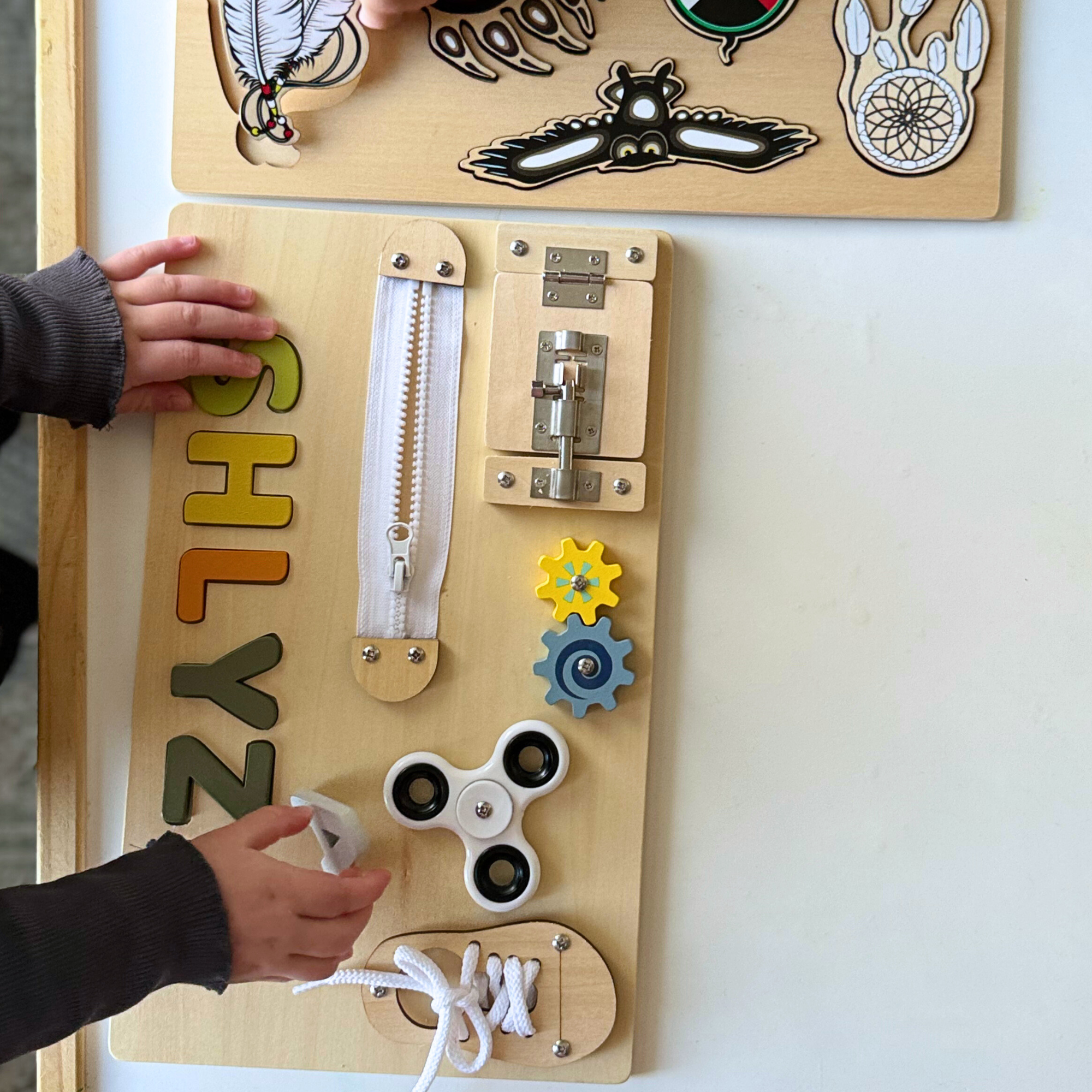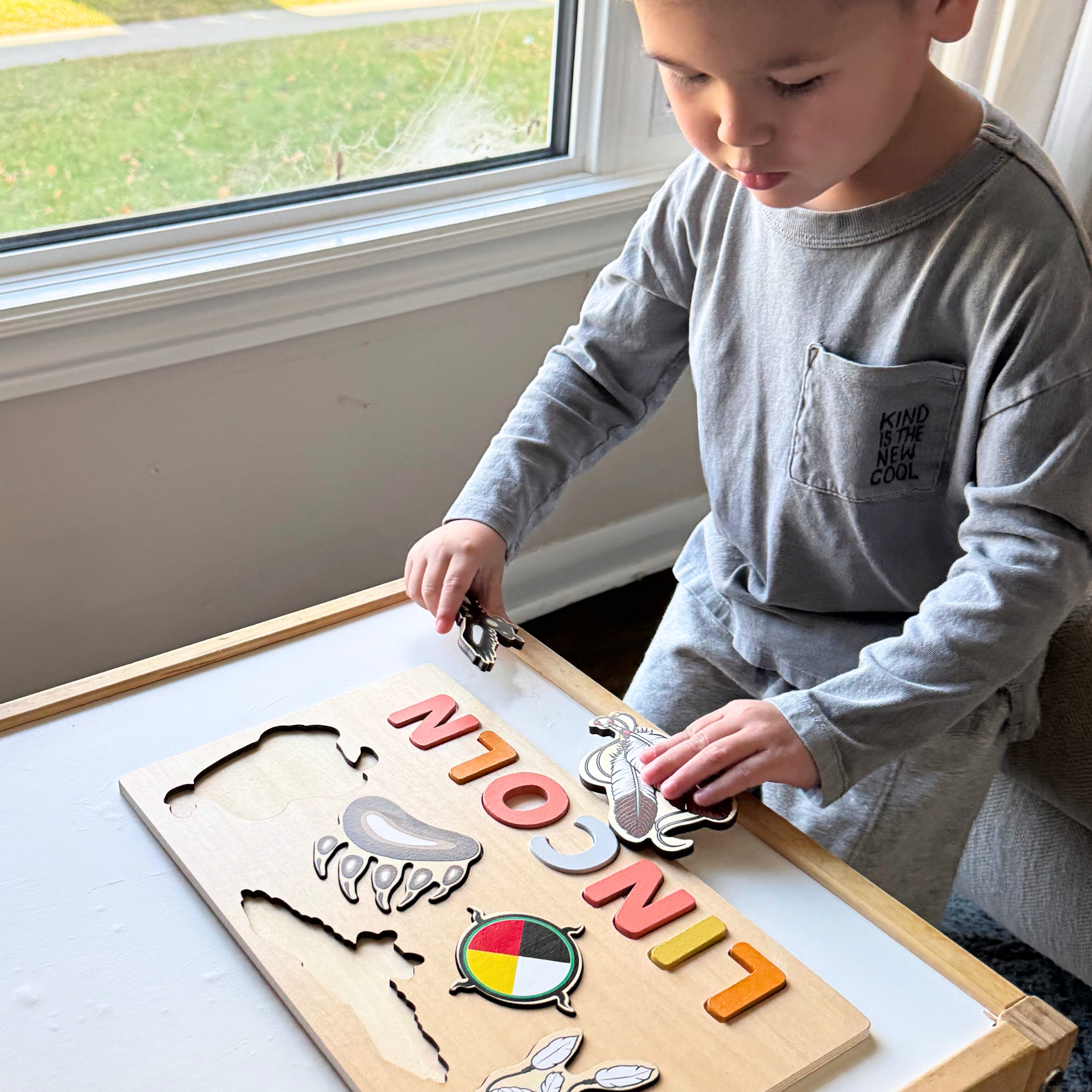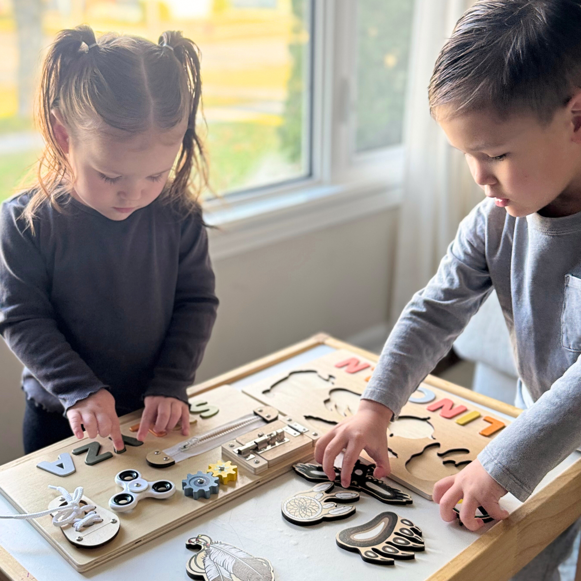 Our custom wooden puzzles are crafted in Canada. Our three puzzles, the Seven Teachings Puzzle, the Icons Puzzle, and the Fidget Puzzle, help children build problem-solving skills, focus, and imagination through play. Customize your puzzle with a name or word up to 7 letters. Wooden letters included.