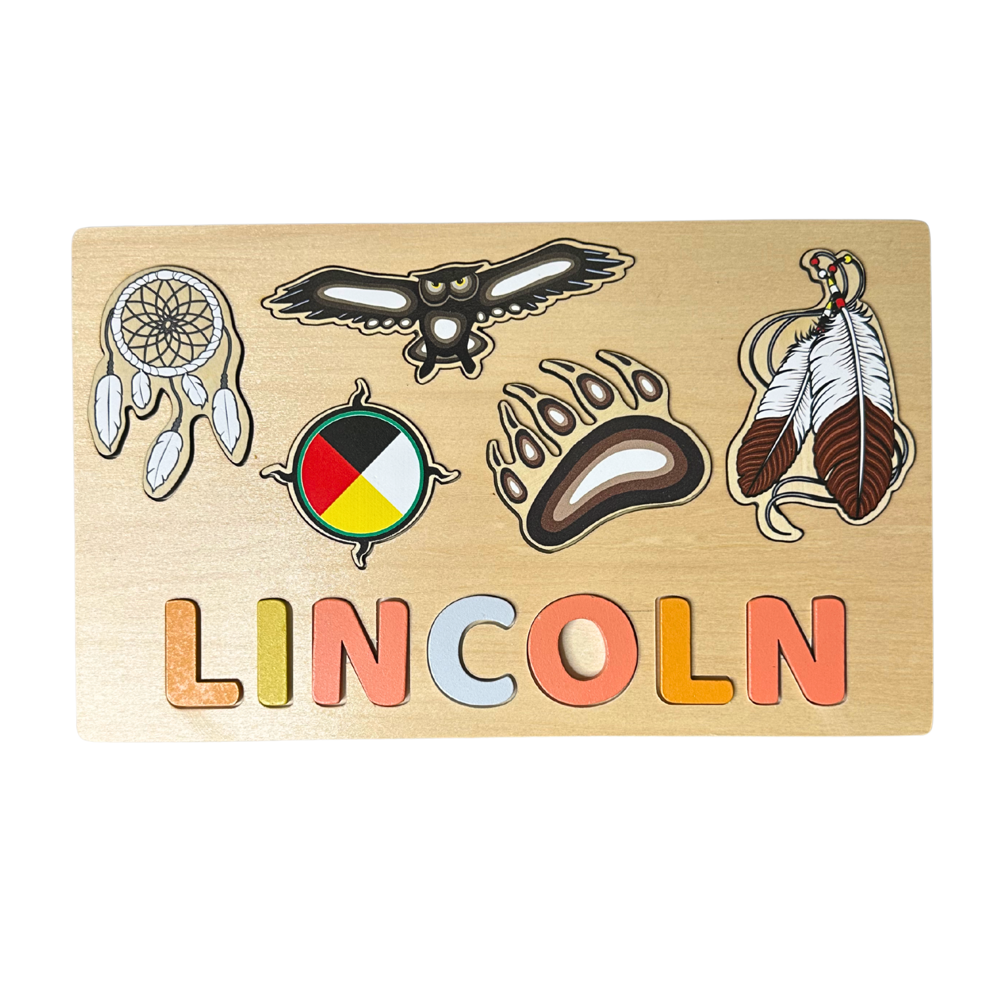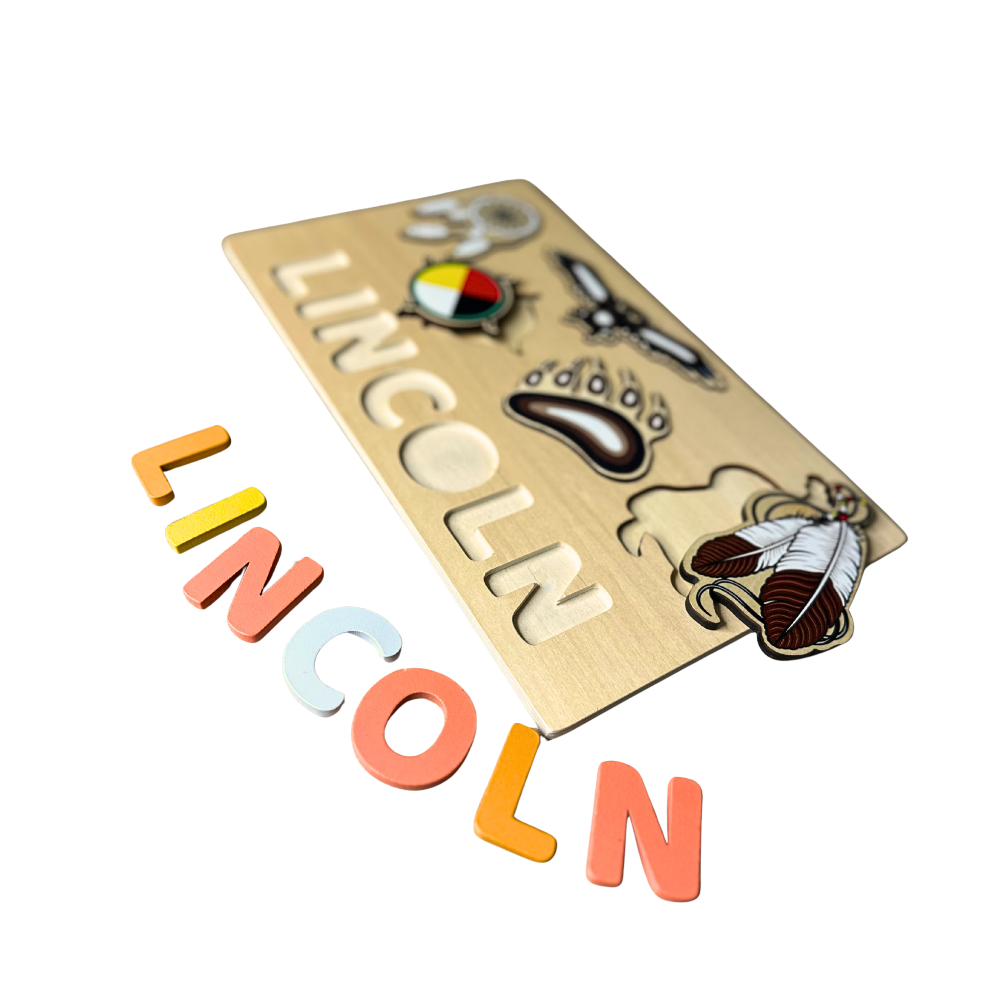 Our custom wooden puzzles are crafted in Canada. Our three puzzles, the Seven Teachings Puzzle, the Icons Puzzle, and the Fidget Puzzle, help children build problem-solving skills, focus, and imagination through play. Customize your puzzle with a name or word up to 7 letters. Wooden letters included.