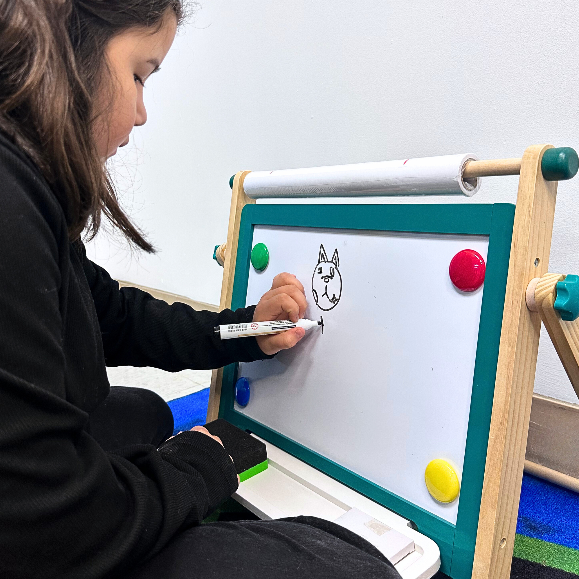 This versatile art easel inspires creativity and self-expression while supporting fine motor skills, social interaction, and communication at home or in the classroom.